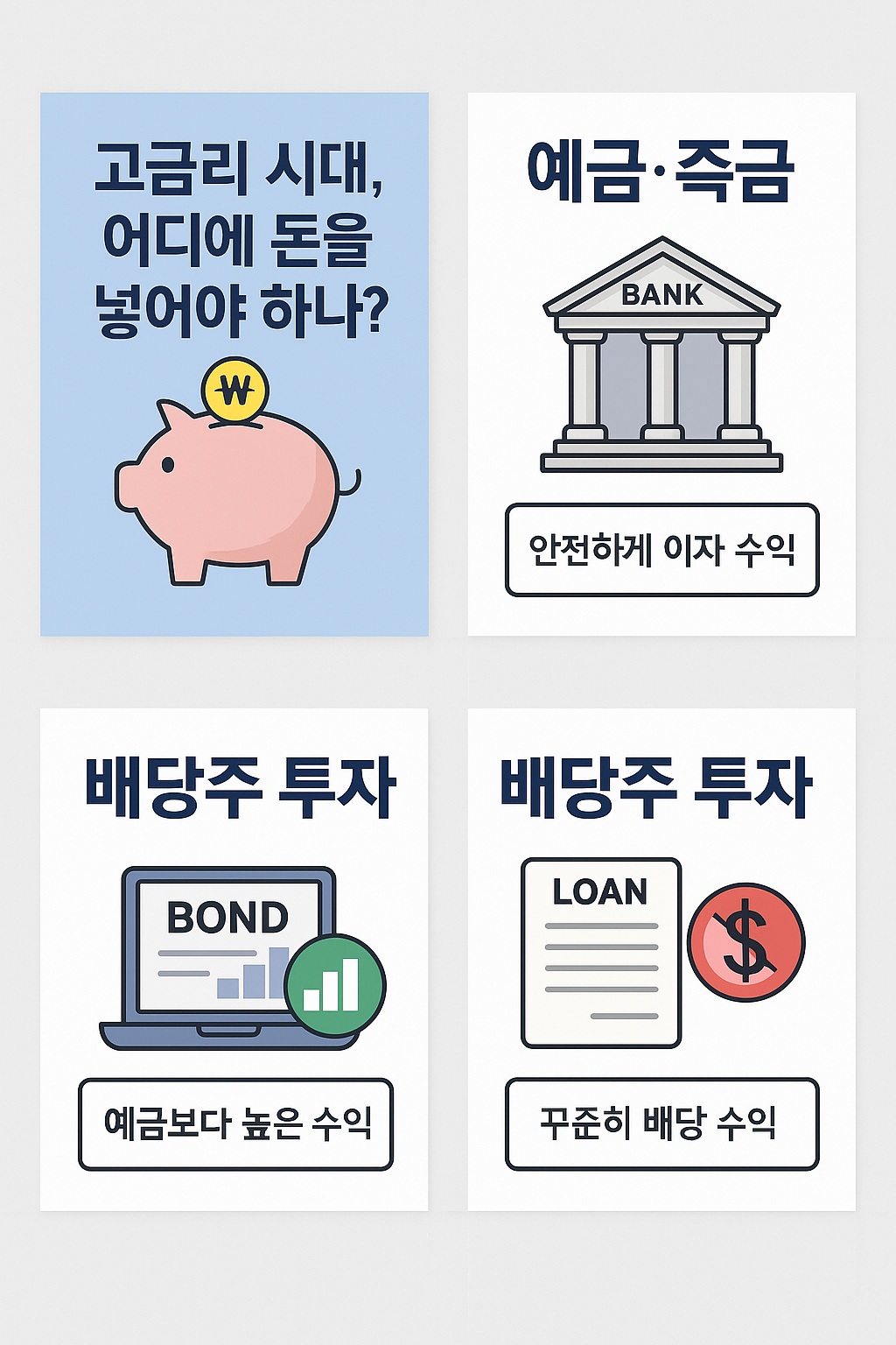간단히 결론부터 말하면, 안정적인 예적금을 기본으로 깔고, 여기에 **저위험 투자 상품(채권, 배당주, 일부 ETF 등)**을 더하는 식으로 돈을 굴리는 것이 가장 좋습니다. 지금부터 고금리 시대에 돈을 어디에 넣어야 하는지 하나씩 살펴볼게요.